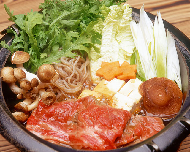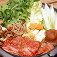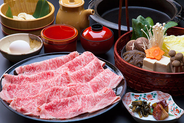 霜降りのお肉と野菜を鍋に入れ、秘伝の割り下がより旨味を引き出してくれる、当店自慢の関東風すき焼き。〈A-4等級 飛騨牛コース〉